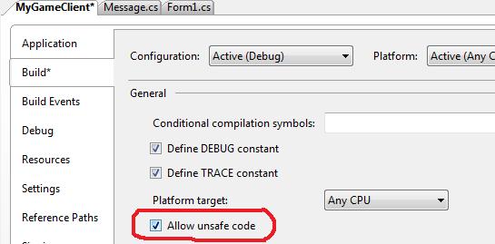 Copying memory directly requires the use of the unsafe statement, which by default is not permitted. To enable it, we must adjust the project settings.