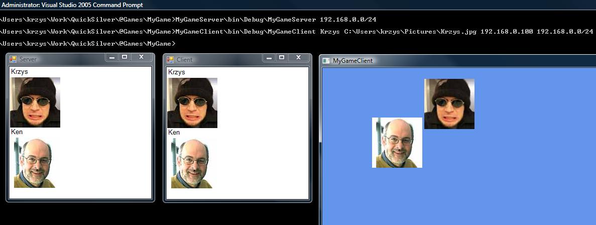 At this point, you should be able to compile the solution, and run the server and two clients on separate machines (the server can be colocated with one of the clients, but the clients can't be colocated). Each of the playes should be able to move its picture around the screen independently. As it moves, the other players should see its movements on their client consoles.