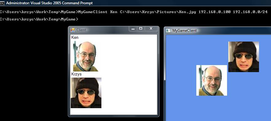 At this point, you can compile and run the server and the client, as shown below. The last parameter to the client invocation should specify the IP address of the server. Make sure that the firewall allows the traffic through. You may need to enable TPC port 60000. If you're running Windows Vista, you may need to run the server from an elevated command prompt (started using the "Run As Administrator" option), otherwise Vista won't allow the game server to register itself as an HTTP server.